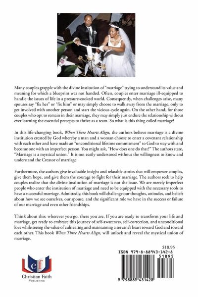 Many couples grapple with the divine institution of "marriage" trying to understand its value and meaning for which a blueprint was not handed. Often, couples enter marriage ill-equipped to handle the issues of life in a pressure-cooked world. Consequently, when challenges arise, many spouses say "fix her" or "fix him" or may simply choose to walk away from the marriage, only to get involved with another person and start the vicious cycle again. On the other hand, for those couples who opt to remain in their marriage, they may simply just endure the relationship without ever learning the essential precepts to thrive as a team. So what is this thing called marriage? In this life-changing book, When Three Hearts Align, the authors believe marriage is a divine institution created by God whereby a man and a woman choose to enter a covenant relationship with each other and have made an "unconditional lifetime commitment" to God to stay with and become one with an imperfect person. You might ask, "How does one do that?" The authors state, "Marriage is a mystical union." It is not easily understood without the willingness to know and understand the Creator of marriage. Furthermore, the authors give invaluable insight and relatable stories that will empower couples, give them hope, and give them the courage to fight for their marriage. The authors seek to help couples realize that the divine institution of marriage is not the issue. We are merely imperfect people who enter the institution of marriage and need to be equipped with the necessary tools to have a successful marriage. Admittedly, this book will challenge our thoughts, attitudes, and beliefs about how we see ourselves, our spouse, and the significant role we have in the success or failure of our marriage and even other friendships. Think about this: wherever you go, there you are. If you are ready to transform your life and marriage, get ready to embrace this journey of self-awareness, self-correction, and unconditional love while seeing the value of cultivating and maintaining a servant's heart toward God and toward each other. This book When Three Hearts Align, will unlock and reveal the mystical union of marriage.