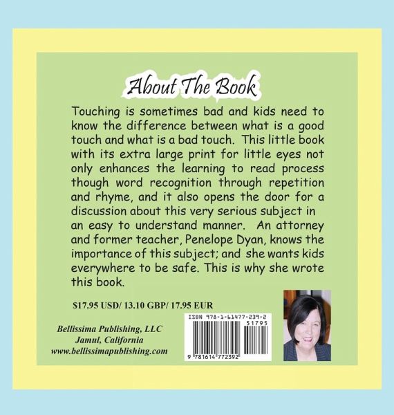 Sometimes touching is bad and sometimes touching is good; and the difference is really quite simple, especially when explained by award winning author, attorney and former teacher, Penelope Dyan in terms a child can really understand. So many, many times explaining these things to children is overlooked; and there is really no good reason NOT to have this very serious discussion with a child. The problem is you do not want to frighten a child, and oftentimes this can happen. Bad people sometimes don't even look scary, and may even be someone you know. What a person does is what defines them, and that is the only discussion here. We need to empower our children and to prevent bad things from happening to them, because once something has happened it is too late to undo. This is why Penelope Dyan has written this book. Children know they are not supposed to talk to strangers, or ride in cars with strangers, or take candy from strangers; but they also need to know what a bad touch is and when touching is bad. This is why Dyan wrote this book. And yes, once again, this book teaches reading skills through word recognition and rhyme, and is filled with lots of fun illustrations and rhyme to encourage kids to shout out words! There is also a music video on the Bellissima Publishing, LLC YouTube Bellissimavideo channel that goes along with this book and lends fun support to the discussion.