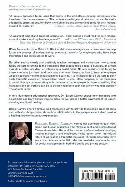 Barbara Barski-Carrow earned her doctorate in adult education and human resources from Virginia Tech and is principal of Carrow Associates. Her work focuses on professional relationships, helping managers and employees relate better when individuals return to work after a traumatic life event. Through more than thirty years of experience in the field, she has created educational forums for senior management in both the public and private sectors.
