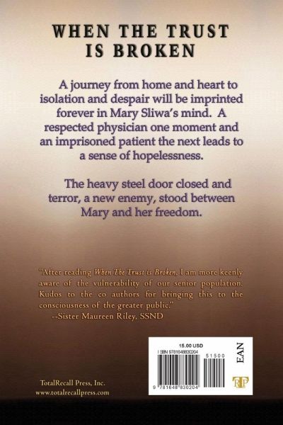 Stella's life changes in a split second when her closest friend, DR.MARY SLIWA phones her, screaming. "Stella, please help me!" Stella discovers that her friend's niece has surreptitiously admitted her to a locked Alzheimer unit. Stella and Mary, a respected and accomplished physician, have known each other for more than thirty years. They met while working at the same hospital and became loyal, trusting friends. Prior to her retirement Mary purchased the empty lot next to Stella and built the house of her dreams for her and her older sister Rita. She was a faith filled person who when she retired at seventy-two, was looking forward to continuing to do God's work as she lived her life in the comfort of her home. Small lapses of memory begin to occur in Mary's daily life. She recognizes the beginning signs of Alzheimer disease and has an attorney establish an irrevocable living trust that states her wish to remain I her home with care, if feasible. She names her niece JEAN as Power of Attorney and Stella as Trustee.