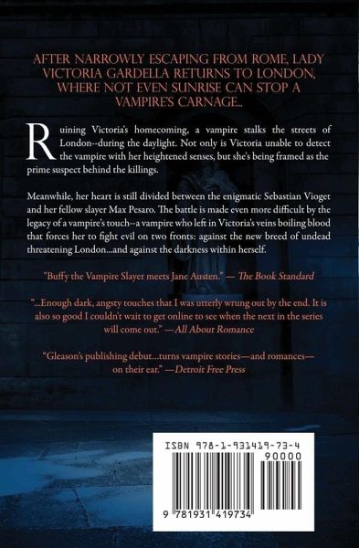 After narrowly escaping from Rome, Lady Victoria Gardella returns to London, where not even sunrise can stop a vampire's carnage... Ruining Victoria's homecoming, a vampire stalks the streets of London--during the daylight. Not only is Victoria unable to detect the vampire with her heightened senses, but she's being framed as the prime suspect behind the killings. Meanwhile, her heart is still divided between the enigmatic Sebastian Vioget and her fellow slayer Max Pesaro. The battle is made even more difficult by the legacy of a vampire's touch--a vampire who left in Victoria's veins boiling blood that forces her to fight evil on two fronts: against the new breed of undead threatening London...and against the darkness within herself. Praise for the Gardella Vampire Hunters "Buffy the Vampire Slayer meets Jane Austen." -The Book Standard "...Enough dark, angsty touches that I was utterly wrung out by the end. It is also so good I couldn't wait to get online to see when the next in the series will come out." -All About Romance "Gleason's publishing debut...turns vampire stories-and romances-on their ear." -The Detroit News
