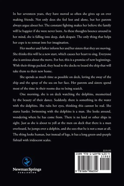 In her seventeen years, they have moved so often she gives up on ever making friends. Not only does she feel lost and alone, but her parents always argue about her. The constant fighting makes her believe the family will be happier if she were never born. As these thoughts bounce around in her mind, she is falling into deep, dark despair. The only thing that helps her cope is to retreat into her imagination. Her mother and father inform her and her sisters that they are moving. She thinks this will be a new start, which causes her heart to sing. Everyone else is anxious about the move. For her, this is a promise of new beginnings. With their things packed, they head to the docks to board the ship that will take them to their new home. She spends as much time as possible on deck, loving the sway of the ship and the spray of the sea on her face. Her parents and sisters spend most of the time in their rooms due to being seasick. One morning, she is on deck watching the dolphins, mesmerized by the beauty of their dance. Suddenly, there is something in the water with the dolphins. She rubs her eyes, thinking this cannot be real. She stares harder. Swimming with the dolphins is a man. She looks around, wondering where he has come from. There is no land or other ships in sight. Just as she is about to yell at the men on deck that there is a man overboard, he jumps over a dolphin, and she sees that he is not a man at all. The thing looks human, but instead of legs, it has a long green-and-purple fishtail with iridescent scales.