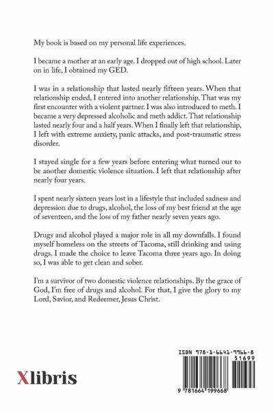 My book is based on my personal life experiences. I became a mother at an early age. I dropped out of high school. Later on in life, I obtained my GED. I was in a relationship that lasted nearly fifteen years. When that relationship ended, I entered into another relationship. That was my first encounter with a violent partner. I was also introduced to meth. I became a very depressed alcoholic and meth addict. That relationship lasted nearly four and a half years. When I finally left that relationship, I left with extreme anxiety, panic attacks, and post-traumatic stress disorder. I stayed single for a few years before entering what turned out to be another domestic violence situation. I left that relationship after nearly four years. I spent nearly sixteen years lost in a lifestyle that included sadness and depression due to drugs, alcohol, the loss of my best friend at the age of seventeen, and the loss of my father nearly seven years ago. Drugs and alcohol played a major role in all my downfalls. I found myself homeless on the streets of Tacoma, still drinking and using drugs. I made the choice to leave Tacoma three years ago. In doing so, I was able to get clean and sober. I'm a survivor of two domestic violence relationships. By the grace of God, I'm free of drugs and alcohol. For that, I give the glory to my Lord, Savior, and Redeemer, Jesus Christ.