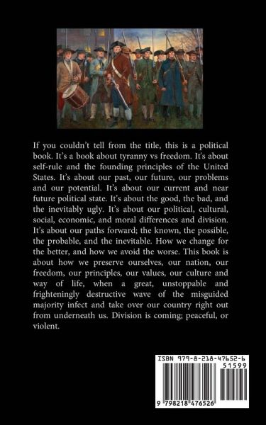 If you couldn't tell from the title, this is a political book. It's a book about tyranny vs freedom. It's about self-rule and the founding principles of the United States. It's about our past, our future, our problems and our potential. It's about our current and near future political state. It's about the good, the bad, and the inevitably ugly. It's about our political, cultural, social, economic, and moral differences and division. It's about our paths forward; the known, the possible, the probable, and the inevitable. How we change for the better, and how we avoid the worse. This book is about how we preserve ourselves, our nation, our freedom, our principles, our values, our culture and way of life, when a great, unstoppable and frighteningly destructive wave of the misguided majority infect and take over our country right out from underneath us. Division is coming; peaceful, or violent.