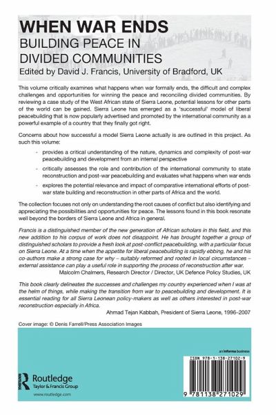 Contents: Introduction: when war ends: building peace in divided communities - core issues, David J. Francis; Saving liberal peacebuilding, Roland Paris; Economic aspects of post-conflict development, Willemijn Verkoren and Gerd Junne; Post-conflict peacebuilding in Africa: between 'virtual peace' and the search for legitimacy, Oscar Mateos; Sierra Leone: a case the international community finally got somewhat right, Bryan Crawford-Garrett; Trickle-down peace: how liberal peacebuilding may be failing Sierra Leone, Carla Castañeda; Public health and peace building in post-war Sierra Leone, Mohamed Kanu; The role of higher education in developing and sustaining peace in Sierra Leone, Mohamed C. Kamanda; Coming to terms with liberal peace-building in post-war Liberia and Sierra Leone, M.A. Mohamed Salih; Bibliography; Index.