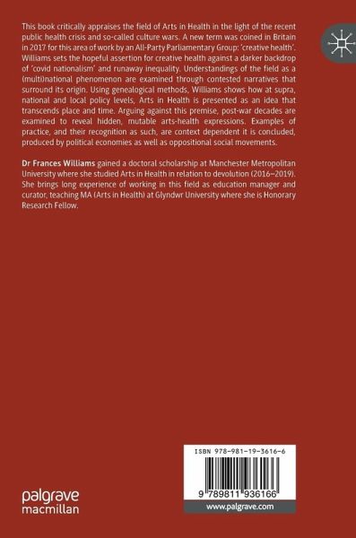 This book critically appraises the field of Arts in Health in the light of the recent public health crisis and so-called culture wars. A new term was coined in Britain in 2017 for this area of work by an All-Party Parliamentary Group: "creative health". Williams sets this hopeful assertion against a darker backdrop of austerity, rising inequality and "Covid-nationalism". Understandings of the field as a (multi)national phenomenon are examined through contested narratives that surround its origin. Using genealogical methods, Williams shows how at supra, national and local policy levels, Arts in Health is presented as an idea that transcends place and time. Arguing against this premise, post-war decades are examined to reveal hidden, mutable arts-health expressions. Examples of practice, and their recognition as such, are context dependent it is concluded - produced by political economies as well as oppositional social movements.