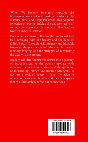 "When We Became Strangers" captures the bittersweet essence of relationships transformed by distance, time, and unspoken words. This poignant collection of poems unfolds the delicate layers of connection, exploring the moments that lead us from intimacy to isolation. Each verse is a mirror reflecting the nuances of love lost, revealing both the beauty and the ache of fading bonds. Through vivid imagery and heartfelt language, the poet delves into the complexities of memory, longing, and the struggles of reconciling the past with the present. Readers will find themselves drawn into a journey of introspection, as the poems resonate with universal themes of separation and the quest for understanding. "When We Became Strangers" is not just a book of poetry; it is an invitation to reflect on the ties that bind us and the silent spaces that can ultimately redefine our connections.