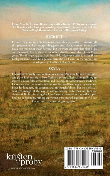 From New York Times Bestselling author Kristen Proby comes When We Break, a small-town, cowboy, heroine in danger romance, set in Bitterroot Valley! Beckett I've seen the gorgeous redhead with the big black dog that never leaves her side around town. She's impossible to miss with that lush red hair and perfect green eyes. But it's when she opens her plump lips and the sound of Ireland comes out of her kissable mouth that I know I'm a goner. I know she's the one for me and I'll do whatever it takes to make Skyla Gallagher mine. I can be a patient man and all I want in the world is to worship every bit of her, inside and out. Skyla I moved to the lovely town of Bitterroot Valley, Montana because I needed a safe place. I left my life in New York as a prima ballerina after an injury that I never fully healed from, and to escape the obsession of a madman. I adore this new community, but I must admit that Beckett Blackwell is the very best part. I love his kindness, his patience, and his thoughtfulness. But most of all, I can't get enough of the way he worships my body, and then does everything he can to pamper me afterwards. Beckett is a drug that I've become addicted to. But will my stalker find me in Montana, ruining everything we've started together, before we have had our chance at forever?
