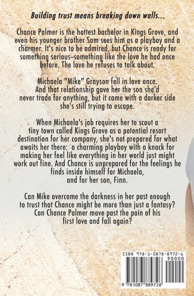 You can't build forever until you break down the walls of yesterday... Chance Palmer is the hottest bachelor in Kings Grove, and even his younger brother Sam sees him as a playboy and a charmer. It's nice to be admired, but Chance is ready for something serious--something like the love he had once before. The love he refuses to talk about. Michaela "Mike" Grayson fell in love once. And though that relationship gave her the son she'd never trade for anything, it came with a darker side she's still trying to escape. When Michaela's job requires her to scout a tiny town called Kings Grove as a potential resort destination for her company, she's not prepared for what awaits her there: a charming playboy with a knack for making her feel like everything in her world just might work out fine. And Chance is unprepared for the feelings he finds inside himself for Michaela, and for her son, Finn. Can Mike overcome the darkness in her past enough to trust that Chance might be more than just a fantasy? Can Chance Palmer move past the pain of his first love and fall again? This is Book 3 in the Kings Grove Series. Each book can be read as a standalone.