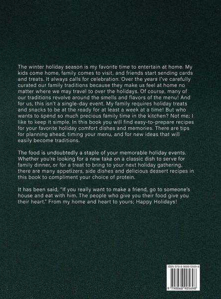 The winter holiday season is my favorite time to entertain at home. My kids come home, family comes to visit, and friends start sending cards and treats. It always calls for celebration. Over the years I've carefully curated our family traditions because they make us feel at home no matter where we may travel to over the holidays. Of course, many of our traditions revolve around the smells and flavors of the menu! And for us, this isn't a single-day event. My family requires holiday treats and snacks to be at the ready for at least a week at a time! But who wants to spend so much precious family time in the kitchen? Not me; I like to keep it simple. In this book you will find easy-to-prepare recipes for your favorite holiday comfort dishes and memories. There are tips for planning ahead, timing your menu, and for new ideas that will easily become traditions. The food is undoubtedly a staple of your memorable holiday events. Whether you're looking for a new take on a classic dish to serve for family dinner, or for a treat to bring to your next holiday gathering, there are many appetizers, side dishes and delicious dessert recipes in this book to compliment your choice of protein. It has been said, "If you really want to make a friend, go to someone's house and eat with him...the people who give you their food give you their heart." From my home and heart to yours; Happy Holidays!