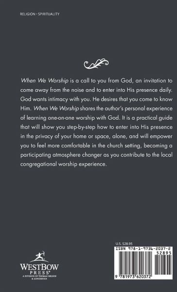 When We Worship is a call to you from God, an invitation to come away from the noise and to enter into His presence daily. God wants intimacy with you. He desires that you come to know Him. When We Worship shares the author's personal experience of learning one-on-one worship with God. It is a practical guide that will show you step-by-step how to enter into His presence in the privacy of your home or space, alone, and will empower you to feel more comfortable in the church setting, becoming a participating atmosphere changer as you contribute to the local congregational worship experience.