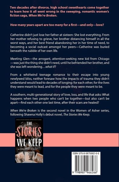 Two decades after divorce, high school sweethearts come together to learn how it all went wrong in the sweeping, romantic women's fiction saga, When We're Broken. How many years apart are too many for a first-and only-love? Catherine didn't just lose her father at sixteen: She lost everything. From her mother refusing to grieve, her brother distancing himself in all the worst ways, and her best friend abandoning her in her time of need, to becoming a social outcast amongst her peers-Catherine was buried beneath the rubble of her own life. Meeting Glen-the arrogant, attention-seeking new kid from Chicago-was just the thing she didn't need, until he befriended her brother, and she was left wondering...what if? From a whirlwind teenage romance to their escape into young newlywed bliss, neither foresaw how the impacts of trauma they didn't understand would lead to decades of longing: for each other, for the lives they were meant to lead, and for the people they were meant to be. A southern, multi-generational story of love, loss, and life that asks: What happens when two people who can't be together-but also can't be apart-find each other one last time, after their scars are healed? When We're Broken is the second novel in the Women of Asher series, following Shawna Holly's debut novel, The Stories We Keep.