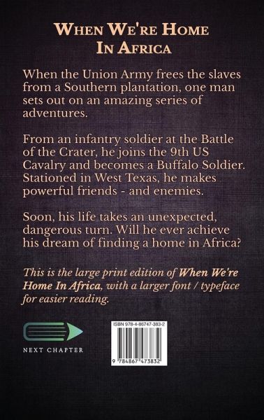 When the Union Army frees the slaves from a Southern plantation, one man sets out on an amazing series of adventures. From an infantry soldier at the Battle of the Crater, he joins the 9th US Cavalry and becomes a Buffalo Soldier. Stationed in West Texas, he makes powerful friends - and enemies. Soon, his life takes an unexpected, dangerous turn. Will he ever achieve his dream of finding a home in Africa? This is the large print edition of When We're Home In Africa, with a larger font / typeface for easier reading.