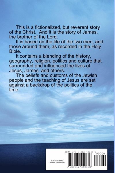 This is a fictionalized, but reverent, story of the Christ. And it is the story of James, the brother of the Lord. It is based on the life of the two men, and those around them, as recorded in the Holy Bible. It contains a blending of the history, geography, religion, politics and culture that surrounded and influenced the lives of Jesus, James and others. The beliefs and customs of the Jewish people and the teaching of Jesus are set against a backdrop of the politics of the time.
