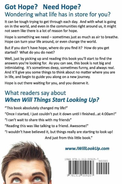Named one of the Top 100 Independent Books of 2015 by ShelfUnbound Magazine, and their Top Rated Christian book of the Year! It can be tough trying to get through each day. And with what is going on in the world, and even in the communities right around us, it might not seem like there is a lot of reason for hope. Hope is something we need - sometimes just as much as air to breathe. Hope can turn your life around, or even change the world. But if you don't have hope, where do you find it? How do you get started? What do you do next? This book will help you start to find the answers you're looking for. This book is not big and intimidating. It's sometimes deep, sometimes funny, and always real. It'll give you some things to think about no matter where you are in life, and begin to guide you along on a new journey. "When Will things start Looking Up?" is a beginner's guide to hope and prayer written for teens and young adults that will give you hope for today and tomorrow.