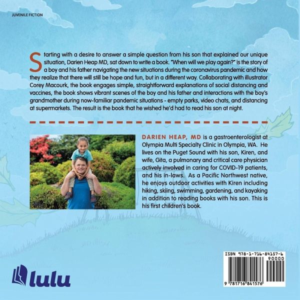 Starting with a desire to answer a simple question from his son that explained our unique situation, Darien Heap MD, sat down to write a book. "When will we play again?" is the story of a boy and his father navigating the new situations during the coronavirus pandemic and how they realize that there will still be hope and fun, but in a different way. Collaborating with illustrator Corey Macourk, the book engages simple, straightforward explanations of social distancing and vaccines, the book shows vibrant scenes of the boy and his father and interactions with the boy's grandmother during now-familiar pandemic situations - empty parks, video chats, and distancing at supermarkets. The result is the book that he wished he'd had to read his son at night.