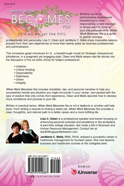 Whether you're an administrative professional transitioning to more responsibility, a new manager, or simply want to "tune up" your interpersonal skills, When Work Becomes You is a guide to greater success professionally and personally. Lisa C. Olsen and JanMarie C. Malik share invaluable lessons plucked from their own experiences of more than twenty years as business professionals and administrators. This innovative guide introduces S.I.X., a breakthrough model for Strategic Interpersonal eXcellence. In a pragmatic yet engaging style, Olsen and Malik weave real-life stories into the discussion of the six skills critical for today's professional: · Initiative · Critical thinking · Dependability · Diplomacy · Grace · Integrity When Work Becomes You includes checklists, tips, and personal narrative to help you successfully handle any situation you might encounter in your career. Jam-packed with the type of wisdom that only comes from experience, Olsen and Malik describe how to develop more confidence and purpose in your life. Written in practical terms, When Work Becomes You is not a textbook or another self-help book. From writing a resume to finding a better job, When Work Becomes You provides a clear, thoughtful, and rational path to a better career and a more fulfilling life.