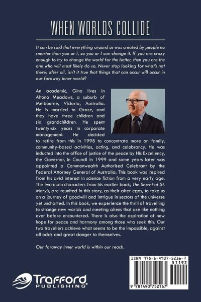 This book was inspired by Gino's avid interest in science fiction from a very early age. He has a firm belief in the existence of extraterrestrial life. The two main characters from his earlier book, "The Secret at St. Mary's," are reunited in this story. They are transformed into their alter egos who take us on a journey of goodwill and intrigue in sectors of the universe yet unchartered. In this book, we experience the thrill of travelling to strange new worlds and meeting aliens that are like nothing ever before encountered. There are the Sebemos of the planet Xulud. They have a body that looks like rough stone and are shaped like a long macaroni noodle. There are six spindly-like tentacles around their bodies, and they have a face that resembles a computer chip. Their leader is Gray Munchkin. There are the Gubeiggas of the planet Esile. They are almost like humans, but with pointy heads and wings. They are quite good-looking. Their leader is Queen Becca. There are the Cyclopzorgs of the planet Ocat, who want to change the way the Sebemos and the Gubeiggas live. They have bodies that are half-bear and half-giraffe. There are the Brainoids of the planet Barbabeetle, who are very wise and want to help Omsoc and Etnorb. This race looks like beautiful sunflowers, with faces that have some humanlike characteristics. Their leader is Onigiul. The immortal, wise one is Aznagarb. There is also the aspiration of new hope for peace and harmony among those who seek this. Our two travelers achieve what seems to be the impossible, against all odds and great danger to themselves.