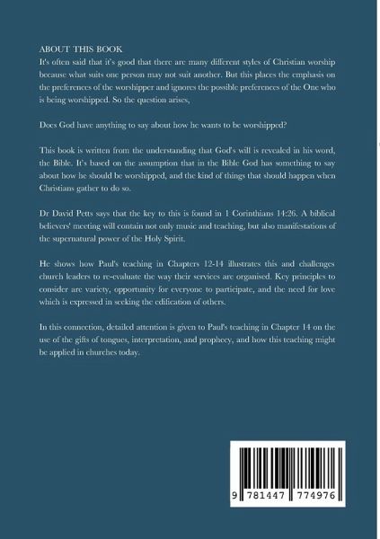 It's often said that it's good that there are many different styles of Christian worship because what suits one person may not suit another. But this places the emphasis on the preferences of the worshipper and ignores the possible preferences of the One who is being worshipped. So the question arises, Does God have anything to say about how he wants to be worshipped? This book is written from the understanding that God's will is revealed in his word, the Bible. It's based on the assumption that in the Bible God has something to say about how he should be worshipped, and the kind of things that should happen when Christians gather to do so. Dr David Petts says that the key to this is found in 1 Corinthians 14:26. A biblical believers' meeting will contain not only music and teaching, but also manifestations of the supernatural power of the Holy Spirit. He shows how Paul's teaching in Chapters 12-14 illustrates this and challenges church leaders to reevaluate the way their services are organised. Key principles to consider are variety, opportunity for everyone to participate, and the need for love which is expressed in seeking the edification of others. In this connection, detailed attention is given to Paul's teaching in Chapter 14 on the use of the gifts of tongues, interpretation, and prophecy, and how this teaching might be applied in churches today.