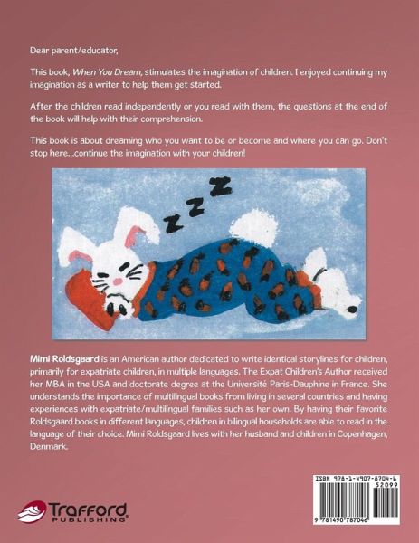 Dear parent/educator, This book, When You Dream, stimulates the imagination of children. I enjoyed continuing my imagination as a writer to help them get started. After the children read independently or you read with them, the questions at the end of the book will help with their comprehension. This book is about dreaming who you want to be or become and where you can go. Dont stop herecontinue the imagination with your children!