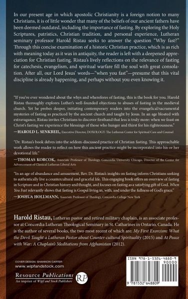 In our present age in which apostolic Christianity is a foreign notion to many Christians, it is of little wonder that many of the beliefs of our ancient fathers have been deemed outdated, including the importance of fasting. By exploring the Holy Scriptures, patristics, Christian tradition, and personal experience, Lutheran seminary professor Harold Ristau seeks to answer the question ""Why fast?"" Through this concise examination of a historic Christian practice, which is as rich with meaning today as it was in antiquity, the reader is left with a deepened appreciation for Christian fasting. Ristau's lively reflections on the relevance of fasting for catechesis, evangelism, and spiritual warfare fill the soul with great consolation. After all, our Lord Jesus' words--""when you fast""--presume that this vital discipline is already happening, and perhaps without you even knowing it.