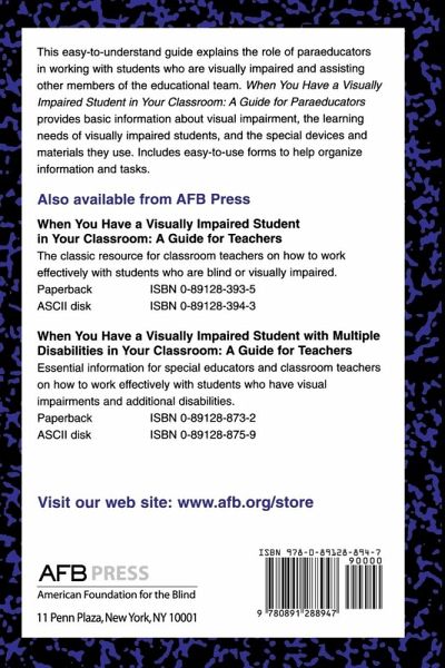 This easy-to-understand guide explains the role of paraeducators (sometimes called classroom aides, teaching assistants, or paraprofessionals) in working with students who are visually impaired and assisting other members of the educational team. When You Have a Visually Impaired Student in Your Classroom: A Guide for Paraeducators provides basic information about visual impairment, the learning needs of visually impaired students, and the special devices and materials they use. Includes easy-to-use forms to help organize information and tasks.