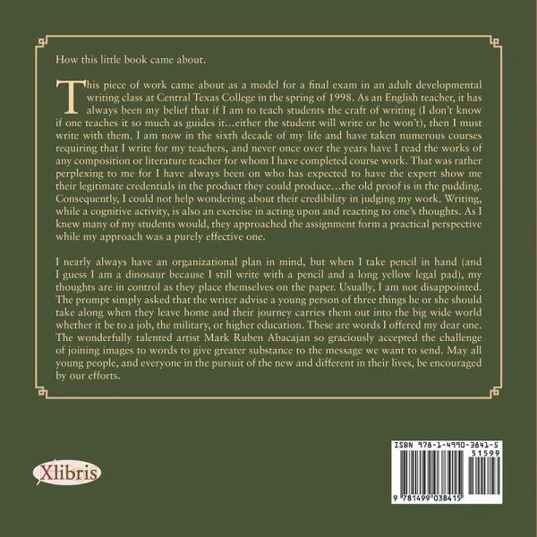 This piece of work came about as a model for a final exam in an adult developmental writing class at Central Texas College in the spring of 1998. As an English teacher, it has always been my belief that if I am to teach students the craft of writing (I don't know if one teaches it so much as guides it...either the student will write or he won't), then I must write with them. I am now in the sixth decade of my life and have taken numerous courses requiring that I write for my teachers, and never once over the years have I read the works of any composition or literature teacher for whom I have completed course work. That was rather perplexing to me for I have always been on who has expected to have the expert show me their legitimate credentials in the product they could produce...the old proof is in the pudding. Consequently, I could not help wondering about their credibility in judging my work. Writing, while a cognitive activity, is also an exercise in acting upon and reacting to one's thoughts. As I knew many of my students would, they approached the assignment form a practical perspective while my approach was a purely effective one. I nearly always have an organizational plan in mind, but when I take pencil in hand (and I guess I am a dinosaur because I still write with a pencil and a long yellow legal pad), my thoughts are in control as they place themselves on the paper. Usually, I am not disappointed. The prompt simply asked that the writer advise a young person of three things he or she should take along when they leave home and their journey carries them out into the big wide world whether it be to a job, the military, or higher education. These are words I offered my dear one. The wonderfully talented artist Mark Ruben Abacajan so graciously accepted the challenge of joining images to words to give greater substance to the message we want to send. May all young people, and everyone in the pursuit of the new and different in their lives, be encouraged by our efforts.