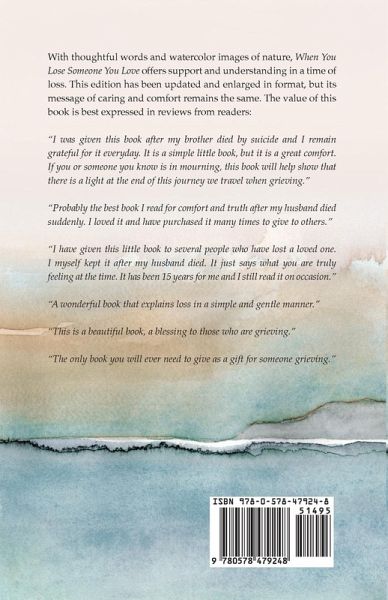New Edition, soft cover and enlarged There are no words deep enough to describe the time of sadness we go through when we lose someone we love. It is difficult to find words of comfort to offer others who are going through a time of loss. With simple words and watercolors of nature, When You Lose Someone You Love offers understanding and support to family and loved ones who are going through sorrow. This new edition has been updated with a soft cover and enlarged in format, but its message remains the same. Susan Florence is grateful for the emails and testimonials that she has received since this book was first published in 1997. They attest to the value of this gentle giftbook. As one reader said, "It is a simple little book, but it is a great comfort. If you or someone you know is in mourning, this book will help show that there is a light at the end of this journey we travel when grieving."