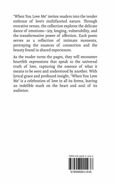 "When You Love Me" invites readers into the tender embrace of love's multifaceted nature. Through evocative verses, the collection explores the delicate dance of emotions-joy, longing, vulnerability, and the transformative power of affection. Each poem serves as a reflection of intimate moments, portraying the nuances of connection and the beauty found in shared experiences. As the reader turns the pages, they will encounter heartfelt expressions that speak to the universal truth of love, capturing the essence of what it means to be seen and understood by another. With lyrical grace and profound insight, "When You Love Me" is a celebration of love in all its forms, leaving an indelible mark on the heart and soul of its audience.