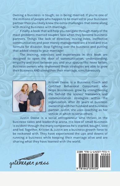 Owning a business is tough; so is being married. If you’re one of the millions of people who happen to be married to your business partner then you likely know the extra challenges that come along with mixing business with marriage. Finally, a book that will help you navigate through many of the main problems married couples face when they become business partners. Things like lack of direction, mixing roles, ineffective communication and poor money management are a tried and true formula for disaster. Stop fighting over the business and putting that added stress to your marriage! The training, exercises and experiences in this book are designed to open the door of communication, understanding, empathy and trust between you and your spouse like never before. Business owners who implement these strategies are able to grow their business AND strengthen their marriage, simultaneously.