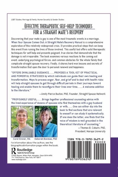 When Your Spouse Comes Out: A Straight Mate's Recovery Manual is a guide that offers solid therapeutic techniques for self-help and presents poignant true stories that examine the various reactions to the coming-out event, the personal challenges and obstacles often experienced, and shares lessons learned and some of the secrets of transformation.