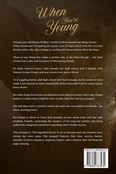A Prequel to "The Impelled Series": Sixteen year old Emma Walker's world revolves around one thing: horses. When Emma isn't navigating her junior year of high school with her two best friends at her side, she is riding or working her horses board off at the barn. There is one thing that taints a perfect day at the barn though - the barn owners son, Luke, and his posse of infuriating friends. To make matters worse, Luke attends her high school and is friends with Emma's former friend, and now sworn rival, Jaclyn Alcott. As if juggling horses and high school isn't hard enough, Jaclyn seems to have made it her mission to make Emma's life all but miserable both at school and at horse shows. But after being forced into accidental close proximity with Luke, Emma begins to realize there might be more to him than she's always assumed. Too bad there isn't a world in which she and Luke can publicly be friends - let alone anything more. But Emma is about to learn that keeping secrets about Luke isn't her only problem. Namely, unraveling the mystery of his long lost mother and being pulled into dangerous situations regarding Luke's family secrets. This prequel to "The Impelled Series" is set in the past and tells Emma's story during her teen years. The prequel features first love, secrets, horses, enemies-to-lovers romance, suspense, humor, and a mystery that will keep the pages turning. (Clean equestrian fiction / romantic suspense series with no sexual content or foul language. Suitable for young adults and adults. This book series is intended to be read sequentially, however this prequel novel can be read first or as a standalone.)