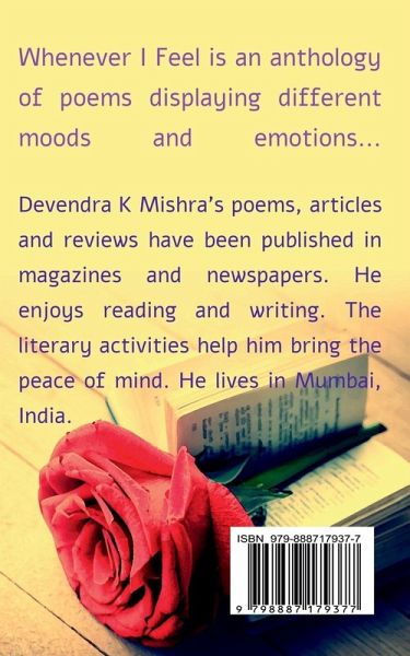 Whenever I Feel is an anthology of poems displaying different moods and emotions...It defines happiness differently and suggests that every moment of life is to be celebrated. These poems are capable of evoking genuine feelings and experiences. Some of these poems are very short, but full of emotions and pictorial imagination. The use of simple diction and beautiful images gives a new dimension and deeper meaning to poems. Whether it is love or death, the treatment of subjects captures the attention of poetry lovers and forces them to read it again and again. The simple but poignant imagery gives a new meaning to each and every poem.