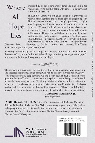 This is a print on demand book and is therefore non- returnable. Where All Hope Lies presents fifty-six select sermons by James Van Tholen, a gifted young pastor who lost his battle with cancer in January 2001 at the age of thirty-six. Though Jim’s untimely death gives a certain poignancy to this volume, these sermons are far from dark or despairing. Van Tholen's conversational style, thought-provoking insights into Scripture, and frequent interaction with such writers as Flannery O'Connor, Frederick Buechner, Kathleen Norris, and others make these sermons truly enjoyable as well as profitable to read. Through them all there runs a sense of concentrating on what really matters—trusting in God no matter what suffering or difficulties might come our way. Indeed, as demonstrated by the book’s title sermon—first published in Chrisitanity Today as "Surprised by Death"—more than anything, Van Tholen preached the grace and goodness of God. Including a foreword by Neal Plantinga and a closing reflection on "the man behind the sermons" by Jim’s wife, Rachel, Where All Hope Lies offers gracious, powerful, uplifting words for believers throughout the church year.