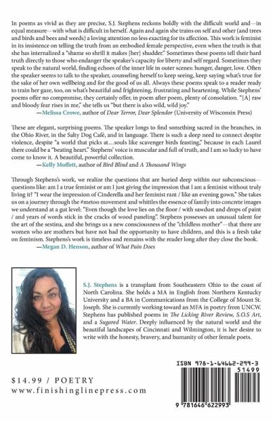 In poems as vivid as they are precise, S.J. Stephens reckons boldly with the difficult world and-in equal measure-with what is difficult in herself. Again and again she trains on self and other (and trees and birds and bees and weeds) a loving attention no less exacting for its affection. This work is feminist in its insistence on telling the truth from an embodied female perspective, even when the truth is that she has internalized a "shame so shrill it makes [her] shudder." Sometimes these poems tell their hard truth directly to those who endanger the speaker's capacity for liberty and self regard. Sometimes they speak to the natural world, finding echoes of the inner life in outer scenes: hunger, danger, love. Often the speaker seems to talk to the speaker, counseling herself to keep seeing, keep saying what's true for the sake of her own wellbeing and for the good of us all. Always these poems speak to a reader ready to train her gaze, too, on what's beautiful and frightening, frustrating and heartening. While Stephens' poems offer no compromise, they certainly offer, in poem after poem, plenty of consolation. "[A] raw and bloody fear rises in me," she tells us "but there is also wild, wild joy." -Melissa Crowe, author of Dear Terror, Dear Splendor (University of Wisconsin Press) These are elegant, surprising poems. The speaker longs to find something sacred in the branches, in the Ohio River, in the Salty Dog Café, and in language. There is such a deep need to connect despite violence, despite "a world that picks at...souls like scavenger birds feasting," because in each Laurel there could be a "beating heart." Stephens' voice is muscular and full of truth, and I am so lucky to have come to know it. A beautiful, powerful collection. -Kelly Moffett, author of Bird Blind and A Thousand Wings Through Stephens's work, we realize the questions that are buried deep within our subconscious-questions like: am I a true feminist or am I just giving the impression that I am a feminist without truly living it? "I wear the impression of Cinderella and her feminist rant / like an evening gown." She takes us on a journey through the #metoo movement and whittles the essence of family into concrete images we understand at a gut level: "Even though the love lies on the floor / with sawdust and drops of paint / and years of words stick in the cracks of wood paneling". Stephens possesses an unusual talent for the art of the sestina, and she brings us a new consciousness of the "childless mother"-that there are women who are mothers but have not had the opportunity to have children, and this is a fresh take on feminism. Stephens's work is timeless and remains with the reader long after they close the book. -Megan D. Henson, author of What Pain Does