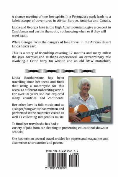 A chance meeting of two free spirits in a Portuguese park leads to a kaleidoscope of adventures in Africa, Europe, America and Canada. Linda and Georgia hike in the High Atlas mountains, give a concert in Casablanca and part in the south, not knowing when or if they will meet again. While Georgia faces the dangers of lone travel in the African desert Linda heads east. This is a story of friendship covering 17 months and many miles: the joys, sorrows and mishaps experienced. An extraordinary tale involving a Celtic harp, tin whistle and an old BMW motorbike.