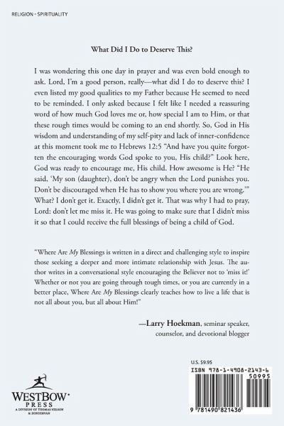 What Did I Do to Deserve This? I was wondering this one day in prayer and was even bold enough to ask. Lord, I'm a good person, really-what did I do to deserve this? I even listed my good qualities to my Father because He seemed to need to be reminded. I only asked because I felt like I needed a reassuring word of how much God loves me or, how special I am to Him, or that these rough times would be coming to an end shortly. So, God in His wisdom and understanding of my self-pity and lack of inner-confidence at this moment took me to Hebrews 12:5 "And have you quite forgotten the encouraging words God spoke to you, His child?" Look here, God was ready to encourage me, His child. How awesome is He? "He said, 'My son (daughter), don't be angry when the Lord punishes you. Don't be discouraged when He has to show you where you are wrong.'" What? I don't get it. Exactly, I didn't get it. That was why I had to pray, Lord: don't let me miss it. He was going to make sure that I didn't miss it so that I could receive the full blessings of being a child of God. "Where Are My Blessings is written in a direct and challenging style to inspire those seeking a deeper and more intimate relationship with Jesus. The author writes in a conversational style encouraging the Believer not to 'miss it!' Whether or not you are going through tough times, or you are currently in a better place, Where Are My Blessings clearly teaches how to live a life that is not all about you, but all about Him!" -Larry Hoekman, seminar speaker, counselor, and devotional blogger