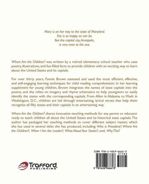 Mary is on her way to the state of Maryland. She is as happy as can be. But the capital city, Annapolis, is very near to the sea. In Where Are the Children?, a retired elementary school teacher uses poetry, illustrations, and fun-filled facts to provide children with an exciting way to learn about the United States and its capitals. For over thirty years, Fannie Brown assessed and used the most efficient, effective, and self-engaging learning techniques for child reading comprehension. In her learning supplement for young children, Brown integrates the names of state capitals into the poems and relies on imagery and rhyme schematics to help youngsters to easily identify the states with the corresponding capitals. From Allen in Alabama to Wash in Washington, DC, children are led through entertaining, lyrical verses that help them recognize all fifty states and their capitals in an entertaining way. Where Are the Children? shares innovative teaching methods for any parent or educator ready to teach children all about the United States and its historical capitals.