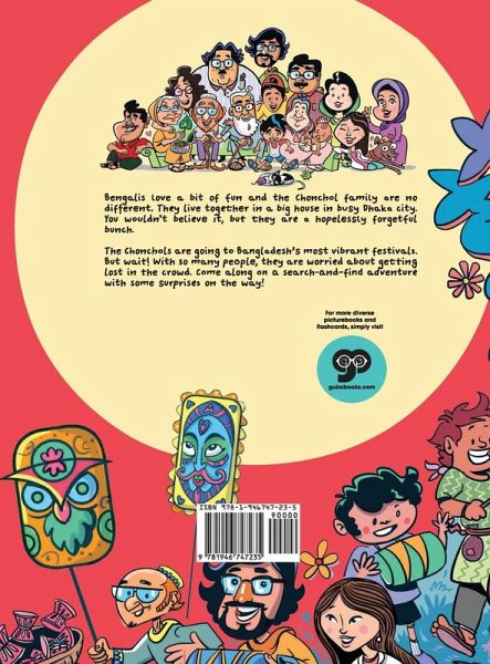 A search and find picture book for children to learn about 12 seasonal festivals in Bangladesh through finding different members of a forgetful Bangladeshi family. The illustrated spreads show traditional festivals and children learn about the location and elements associated with the local culture.