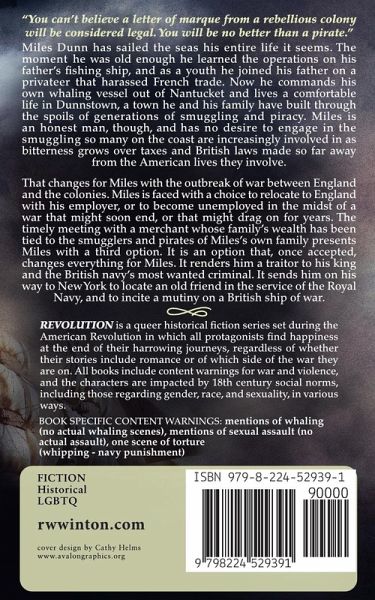 "You can't believe a letter of marque from a rebellious colony will be considered legal. You will be no better than a pirate." Miles Dunn has sailed the seas his entire life it seems. The moment he was old enough he learned the operations on his father's fishing ship, and as a youth he joined his father on a privateer that harassed French trade. Now he commands his own whaling vessel out of Nantucket and lives a comfortable life in Dunnstown, a town he and his family have built through the spoils of generations of smuggling and piracy. Miles is an honest man, though, and has no desire to engage in the smuggling so many on the coast are increasingly involved in as bitterness grows over taxes and British laws made so far away from the American lives they involve. That changes for Miles with the outbreak of war between England and the colonies. Miles is faced with a choice to relocate to England with his employer, or to become unemployed in the midst of a war that might soon end, or that might drag on for years. The timely meeting with a merchant whose family's wealth has been tied to the smugglers and pirates of Miles's own family presents Miles with a third option. It is an option that, once accepted, changes everything for Miles. It renders him a traitor to his king and the British navy's most wanted criminal. It sends him on his way to New York to locate an old friend in the service of the Royal Navy, and to incite a mutiny on a British ship of war. REVOLUTION is a queer historical fiction series set during the American Revolution in which all protagonists find happiness at the end of their harrowing journeys, regardless of whether or not their stories include romance or of which side of the war they are on. SERIES CONTENT WARNINGS: war and violence, 18th century social norms and prejudices (including those regarding gender, race, ethnicity, and sexuality) BOOK SPECIFIC CONTENT WARNINGS: mentions of whaling (no actual whaling scenes), mentions of sexual assault (no actual assault), one scene of torture (whipping - navy punishment)