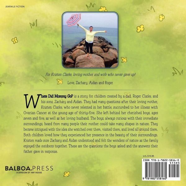 Where Did Mommy Go? is a story for children created by a dad, Roger Clarke, and his sons, Zachary and Aidan. They had many questions after their loving mother, Kristen Clarke, who never relented in her battle, succumbed to her illness with Ovarian Cancer at the young age of thirty-five. She left behind her cherished boys, ages seven and five, as well as her loving husband. The boys, always curious with their immediate surroundings, heard from many people their mother could take many shapes in nature. They became intrigued with the idea she watched over them, visited them, and lived all around them. Both children loved how they experienced her presence in the beauty of their surroundings. Kristen made sure Zachary and Aidan understood and felt the wonders of nature as the family enjoyed the outdoors together. These are the questions the boys asked and the answers their father gave in response.