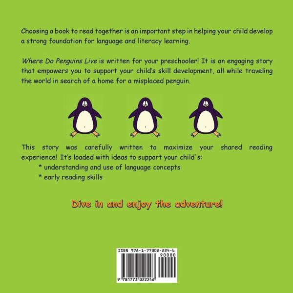 Choosing a book to read together is an important step in helping your child develop a strong foundation for language and literacy learning. Where Do Penguins Live is written for your preschooler! It is an engaging story that empowers you to support your child’s skill development, all while traveling the world in search of a home for a misplaced penguin. The language and literacy level of this story is customized to your child’s development and is loaded with ideas to support your child’s understanding and use of language concepts and early reading skills.