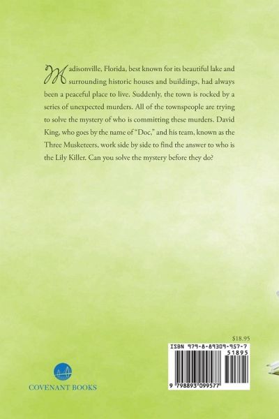 Madisonville, Florida, best known for its beautiful lake and surrounding historic houses and buildings, had always been a peaceful place to live. Suddenly, the town is rocked by a series of unexpected murders. All of the townspeople are trying to solve the mystery of who is committing these murders. David King, who goes by the name of "Doc," and his team, known as the Three Musketeers, work side by side to find the answer to who is the Lily Killer. Can you solve the mystery before they do?