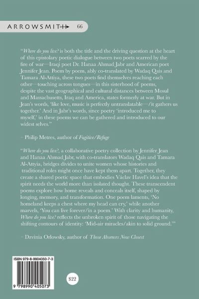 Where Do You Live? is a bilingual, collaborative collection of questions and responses in Arabic and English, written and co-translated by Iraqi poet Dr. Hanaa Ahmad Jabr and American poet Jennifer Jean-with the aid of Iraqi translators Tamara Al-Attiya and Wadaq Qais. In this intensely intimate book, poet talks to poet, and poem talks to poem. The process of the book's creation is a profound gesture towards peace and healing by women who believe in the enduring power of open-hearted dialogue. The "where" in question isn't limited to a physical space but to the places minds and souls linger or reside.