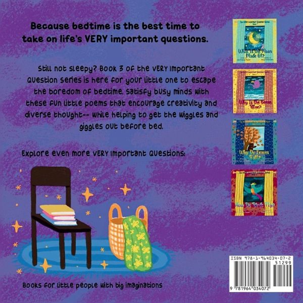 When the wind blows all around, You can hear whispers on the breeze. Explore its secrets before you sleep, And put your mind at ease! Does your little one get distracted at bedtime? Just one more glass of water, a different blanket, and of course, a VERY important question that can't possibly wait until morning... ...Because bedtime is the best time to take on life's VERY important questions! Creative little minds will happily settle down and be ready to rest after exploring one of life's big questions with Book 3 of The VERY Important Question Series. Where Does the Wind Go? is perfect for: ¿ Easy bedtime reading ¿ Bonding moments with both immediate family and extended relatives ¿ Early readers ¿ Readers who enjoy poetry ¿ Gift-giving occasions like birthdays, baby showers, and holidays Your child will: ¿ Explore their imagination through engaging content ¿ Gain confidence in their reading ¿ Be exposed to subtle diversity and multiculturalism ¿ Enjoy beautiful illustrations ¿ Learn to appreciate and respect different opinions and ideas ¿ Be inspired... and then, hopefully, tired Looking for more VERY Important Questions? Collect all five books in this engaging series, with other kid-favorites including Why Do Leaves Fall? and What Is the Moon Made Of? available now from Little Peaces, an imprint of Peace of Prose Publishing. These poem-based stories explore different answers to their respective questions, with some answers whimsical, others rooted in folklore or science, and many of them inspired by real answers from real kids. By presenting inclusivity in a subtle, organic way, this series also strives to present young readers with generalized exposure to different cultural ideologies, fostering acceptance of diversity at an early age. The primary concept, however, is that by embracing the chaos of bedtime, and indulging busy little minds with creative poems and beautiful artwork, children will be able to rest calmer, easier, and more satisfied, allowing for the much-coveted smooth transition to sleep. Where do YOU think the wind goes?