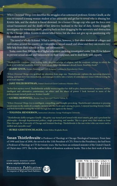 Where Drowned Things Live describes the struggles of an untenured professor, Kristin Ginelli, as she tries to counsel a young woman student at her university and get her to reveal who is abusing her. Kristin fails, and the student is found drowned. As a former Chicago cop who quit the force over sexual harassment and the death of her detective husband in the line of duty, Kristin doggedly investigates this mysterious death, pushing back on foot-dragging by the university and obstruction by the Chicago police. Kristin is almost killed twice, but she does not give up on questioning why this student died. The novel is wholly fictional. What is not fiction, however, is that often students at colleges and universities around the country are vulnerable to sexual assault and abuse and they can receive very little help from their schools or from law enforcement. Today more than 300 schools of higher education are being investigated under Title IX for failures to prevent sexual assault and harassment on their campuses, and to deal fairly with reports.