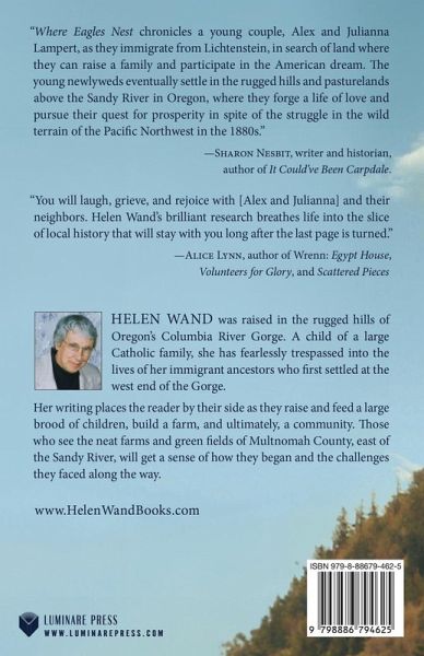 "Where Eagles Nest chronicles a young couple, Alex and Julianna Lampert, as they immigrate from Lichtenstein, in search of land where they can raise a family and participate in the American dream. The young newlyweds eventually settle in the rugged hills and pasturelands above the Sandy River in Oregon, where they forge a life of love and pursue their quest for prosperity in spite of the struggle in the wild terrain of the Pacific Northwest in the 1880s." -Sharon Nesbit, writer and historian, author of It Could've Been Carpdale. "You will laugh, grieve, and rejoice with [Alex and Julianna] and their neighbors. Helen Wand's brilliant research breathes life into the slice of local history that will stay with you long after the last page is turned." -Alice Lynn, author of Wrenn: Egypt House, Volunteers for Glory, and Scattered Pieces