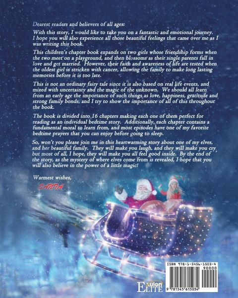 A beautiful fairy tale book for the whole family to enjoy and read together. Where elves Come From is an Award-Winning Finalist in 2018 Readers' Favorite and became an Amazon Best-Seller with many copies sold all over the world. The book helps children of all ages cope with the loss of a loved one. It encourages and teaches kids to use their imaginations, and helps parents explain sensitive topics to their children. Dearest Readers and believers of all ages: With this story, I would like to take you on a fantastic and emotional journey. I hope you will also experience all those beautiful feelings that came over me as I was writing this book. This children's chapter book expands on two girls whose friendship forms when the two meet on a playground, and then blossoms as their single parents fall in love and get married. However, their faith and awareness of life are tested when the oldest girls is stricken with cancer, allowing the family to make long lasting memories before it is too late. This is not an ordinary fairy tale since it is also based on real life events, and mixed with uncertainty and the magic of the unknown. We should all learn from an early age the importance of such things as love, happiness, gratitude and strong family bonds, and I try to show the importance of all of this throughout the book. The book is divided into 16 chapters making each one of the perfect for reading as an individual bedtime story. Additionally, each chapter contains a fundamental moral to learn from, and most episodes have one of my favorite bedtime prayers that you can enjoy before going to sleep. So, won't you please join me in this heartwarming story about one of my elves, and her beautiful family. They will make you laugh, and they will make you cry, but most of all, I hope, they will make you all feel good inside. By the end of the story, as the mystery of where elves come from is revealed, I hope that you will also believe in the power of a little magic! Warmest wishes, SANTA