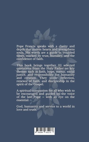 Pope Francis speaks with a clarity and depth that moves hearts and strengthens souls. His words are a guide in troubled times, marked by trust, humility, and the confidence of faith.This book brings together 111 selected quotations from the Holy Father on key themes such as faith, hope, mercy, social justice, and responsibility for humanity and creation. They invite reflection, renewal of faith, and discipleship in the spirit of the Gospel.