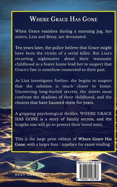 When Grace vanishes during a morning jog, her sisters, Liza and Betsy, are devastated. Ten years later, the police believe that Grace might have been the victim of a serial killer. But Liza's recurring nightmares about their traumatic childhood in a foster home lead her to suspect that Grace's fate is somehow connected to their past. As Liza investigates further, she begins to suspect that the solution is much closer to home. Uncovering long-buried secrets, the sisters must confront the shadows of their childhood, and the choices that have haunted them for years. A gripping psychological thriller, WHERE GRACE HAS GONE is a story of family secrets, and the lengths one will go to protect their loved ones. This is the large print edition of Where Grace Has Gone, with a larger font / typeface for easier reading.